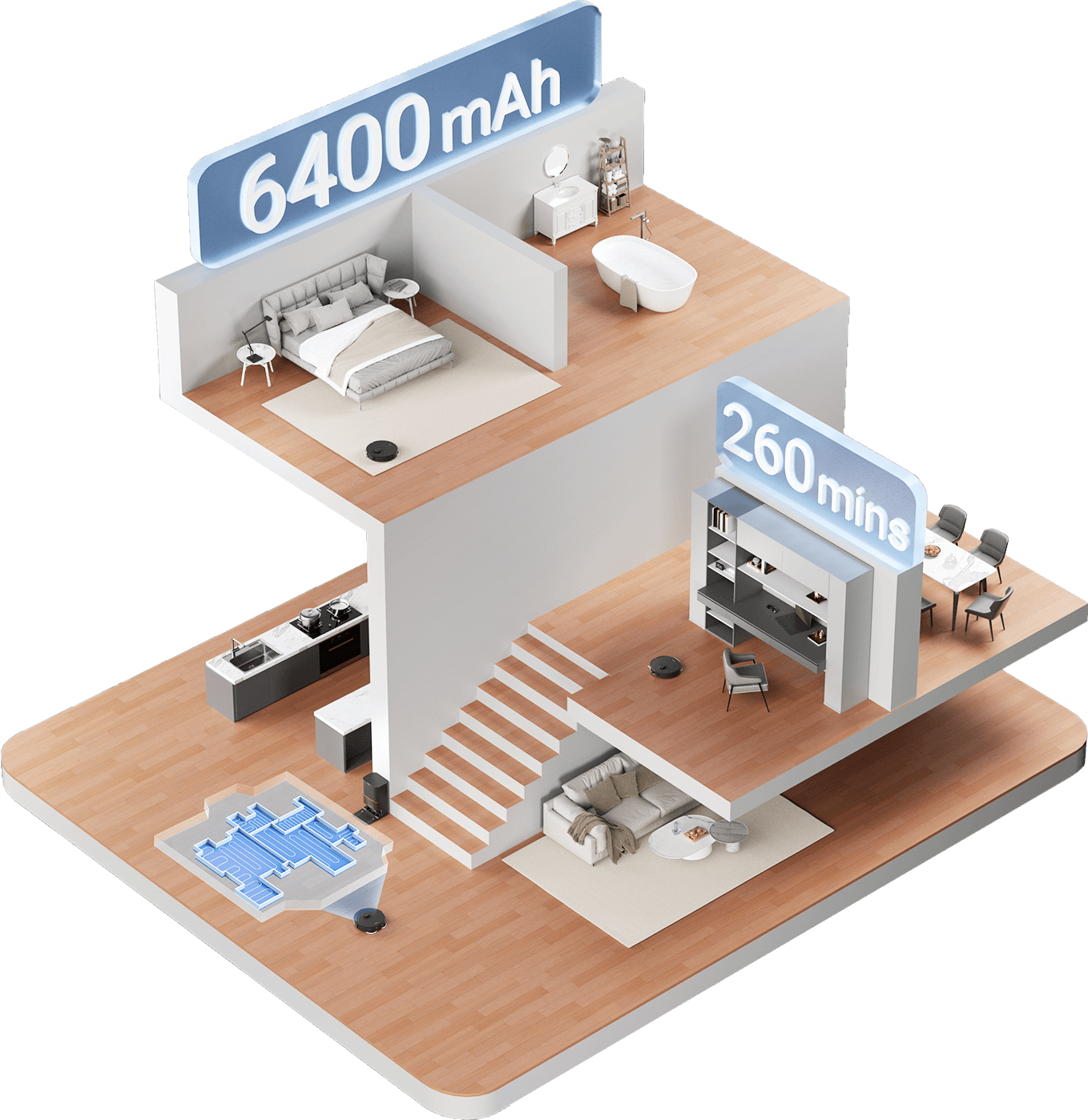 Keep a multi-story house spotless with an ample 6,400mAh battery. Enjoy an uninterrupted vacuuming and mopping experience of up to 260 minutes11 . X30 Ultra tides up your house to 2615ft² (243m²)12 on a single charge, not leaving you powerless during a cleaning task.